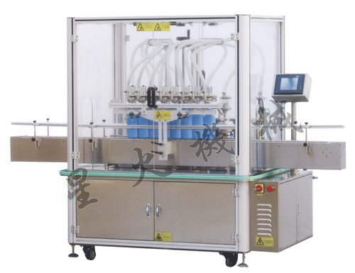 RGS8自動液體灌裝機概述: 快速清洗、快速調(diào)整、容積缸體動作無級調(diào)速,適合不同規(guī)格、不同液體的灌裝;8頭同時灌裝,根據(jù)需要可增加灌裝頭數(shù)量;充填量一次調(diào)整完畢,每個容積缸可分別微量調(diào)節(jié),灌裝精度高且一致性好;接觸液體部件的材料為316L不銹鋼、硅橡膠,符合GMP規(guī)范。 進口減速電機無級調(diào)速控制灌裝柱塞缸,不僅適合各種水劑,亦適合稠粘液體。 進口電磁離合器與電磁制動器配合動作,消除慣性,灌裝精度高。 人機界面與PLC通訊,調(diào)試設(shè)備或更換品種只需在屏幕上設(shè)定。 進瓶、定位、灌裝充填、出瓶均自動作業(yè)。灌裝時瓶子不到位、瓶子堵塞或出液管沒有插進瓶子時設(shè)備將自動保護,排除后繼續(xù)作業(yè)。
