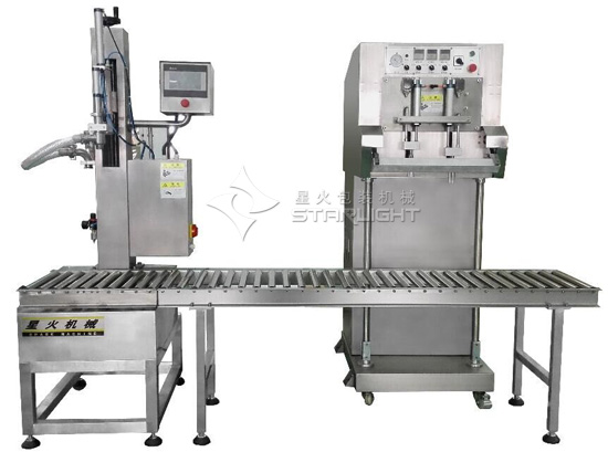 設(shè)備優(yōu)勢(shì): 1、芝麻醬稱(chēng)重灌裝封口機(jī)結(jié)構(gòu)簡(jiǎn)單、緊湊,調(diào)節(jié)方便,文本操作控制,畫(huà)面直觀,操作方便,設(shè)置灌裝重量來(lái)控制灌裝量,觸屏操作,計(jì)量準(zhǔn)確。 2、本機(jī)采用PLC控制,運(yùn)行穩(wěn)定可靠,生產(chǎn)效率高,適用性強(qiáng)。本機(jī)通過(guò)設(shè)置灌裝重量來(lái)控制灌裝量,計(jì)量準(zhǔn)確。 3、采用不銹鋼制作,凡接觸物料及某些相關(guān)部位均采用優(yōu)質(zhì)不銹鋼制作,易清洗。 4、適用性強(qiáng),可灌裝醬料,也可灌裝其他粘稠液體等物料。 5、盒裝袋醬料灌裝封口機(jī)在灌裝過(guò)程中,不起泡、不滴漏、不拉絲、不污染容器口,封口更佳美觀整潔。 星火廠房芝麻醬稱(chēng)重灌裝封口機(jī)樣機(jī)展示:
